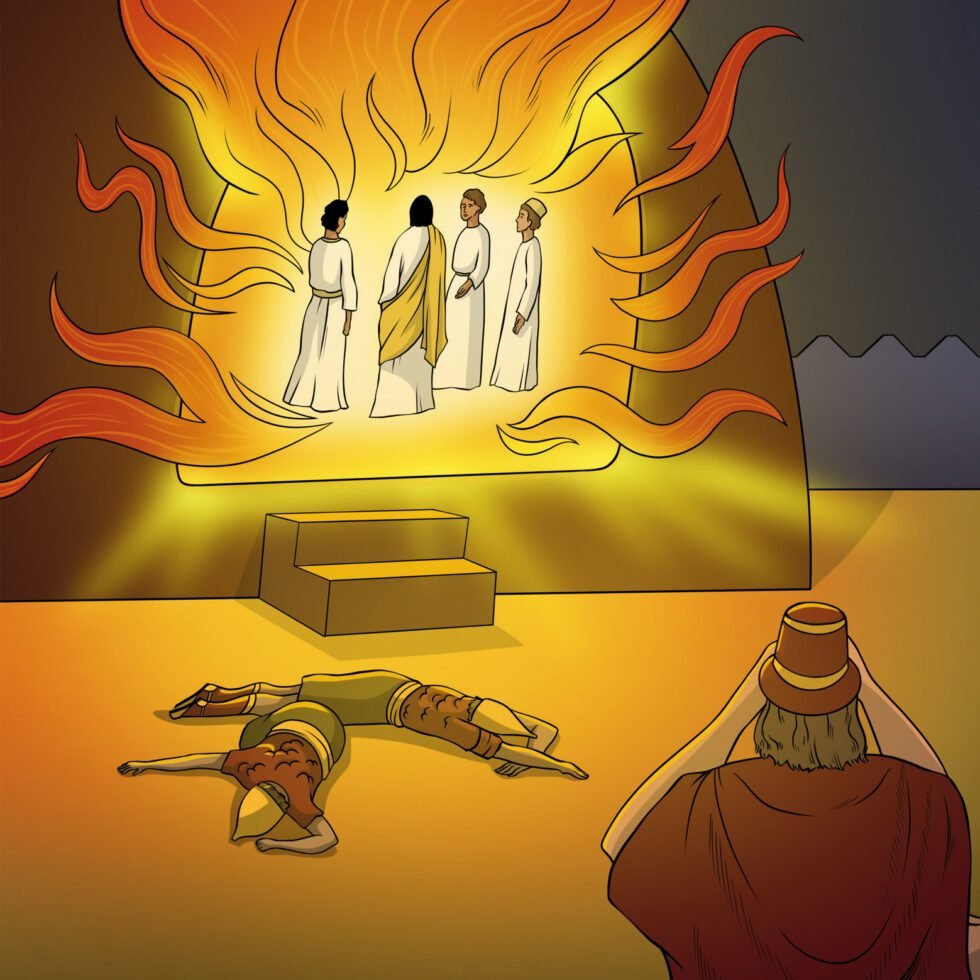 Царь Навуходоносор наблюдал за тем, как Седрах, Мисах и Авденаго были брошены в печь. Но внезапно он увидел что-то невероятное. «Разве не трёх человек мы бросили в печь?» — изумлённо спросил он своих слуг. «Да, царь!» — ответили они. «Но почему я вижу четырёх мужей несвязанных, ходящих среди огня, и нет им вреда? А один из них выглядит, как Ангел Божий!» Поражённый тем, что он увидел, царь поспешно подошёл к печи и крикнул: «Седрах, Мисах и Авденаго! Рабы Бога Живого! Выходите оттуда!» Друзья вышли из печи. Царь и все слуги, стоявшие вокруг, были изумлены. Ни сами молодые люди, ни их одежда и даже волосы не пострадали от огня. Даже запаха дыма от них не было! Царь Навуходоносор воскликнул: «Бог Седраха, Мисаха и Авденаго — истинный Бог! Он защитил Своих слуг и избавил их от смерти за то, что они оказались верны Ему и не поклонились моемуистукану!» Навуходоносор повелел, чтобы всякий, кто скажет что-то плохое о Боге Седраха, Мисаха и Авденаго, будет изрублен на куски, а их дома — разрушены! «Потому что нет другого такого Бога, Который мог бы так спасать!» — объявил он. После этого Навуходоносор ещё больше возвеличил трёх Иудейских друзей в стране Вавилонской.