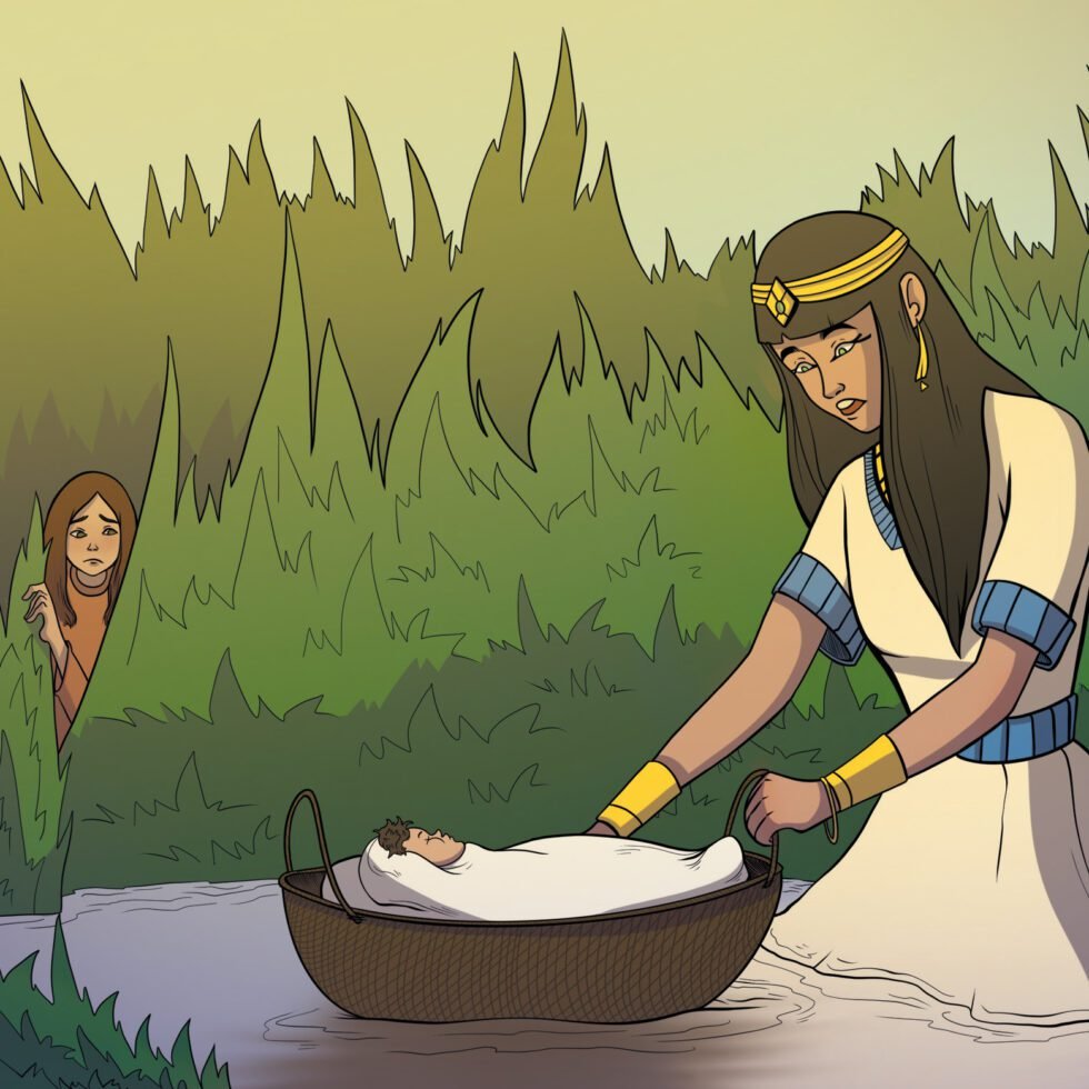 Мариам наблюдала за корзинкой, в которой находился её маленький брат. Через некоторое время она увидела, как дочь фараона вместе со своими служанками пришла к реке, чтобы искупаться. Принцесса заметила в зарослях тростника корзинку. Ей и её служанкам стало очень интересно, что может быть в корзине. Принцесса послала одну из своих рабынь, чтобы та принесла её. Когда корзинку открыли, дочь фараона увидела в ней мальчика: «Это же еврейский ребёнок! Бедняжка! Он такой милый! Я оставлю его в живых! Он будет расти у меня во дворце!» — нежно глядя на ребёнка, сказала принцесса. В это время сестра мальчика подошла к дочери фараона и предложила ей: «Не позвать ли к тебе кормилицу из еврейского народа, чтобы она вскормила тебе младенца?» Дочь фараона ответила: «Ступай за ней скорее!» Мариам быстро побежала домой, позвала свою мать и привела её к принцессе. Дочь фараона сказала ей: «Возьми этого мальчика, и корми его, пока он ещё так мал. А когда он немного подрастёт, я возьму его к себе во дворец, и он будет жить со мной. Я заплачу тебе за это!» Женщина взяла своего малыша и радостно понесла его домой. Так чудесно Бог сохранил её ребёнка.