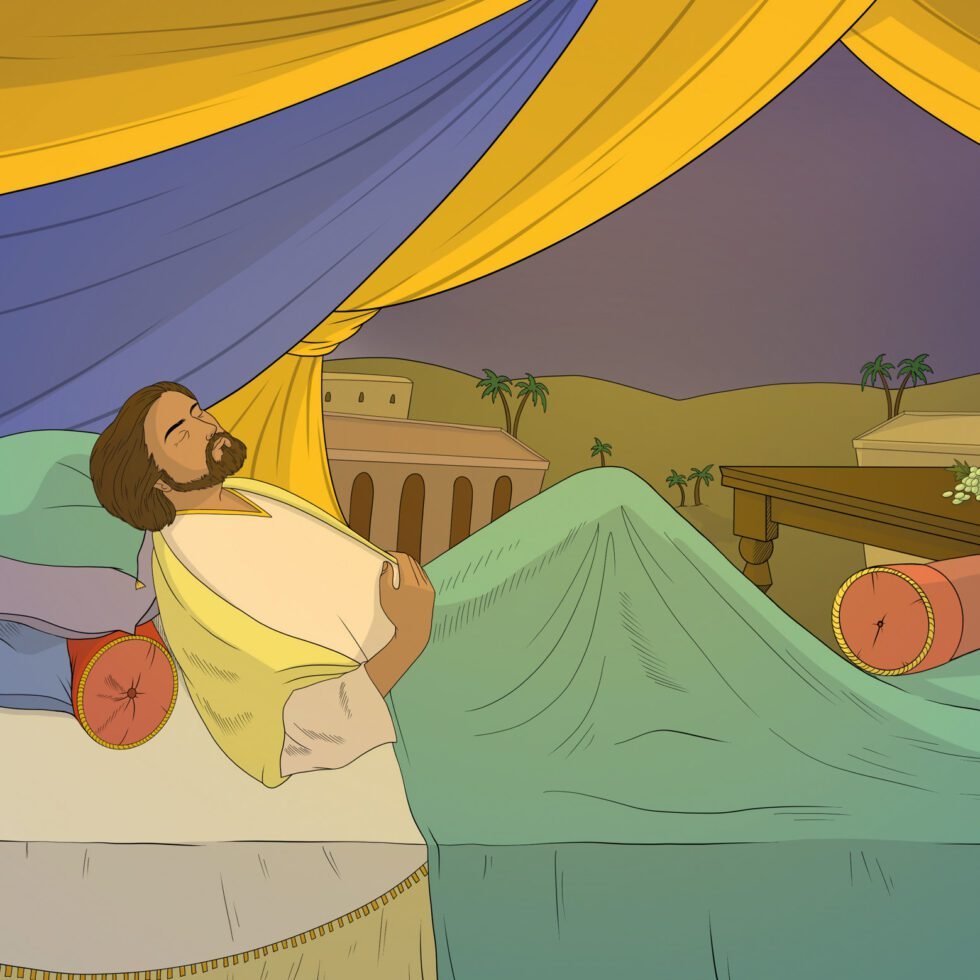 Соломон от всего сердца полюбил Господа и старался исполнять Его заповеди, как это делал его отец Давид. Он пошёл в Гаваон, и принёс там Господу тысячу всесожжений. В ту ночь Бог явился Соломону во сне и сказал ему: «Проси, что дать тебе». Соломон знал, что нелегко быть хорошим царём, чтобы по справедливости судить приходящих к нему людей. «Ты исполнил все обещания, которые дал моему отцу Давиду. Ты поставил меня царём. Но я ещё очень молод и не знаю, как управлять Твоим многочисленным народом. Даруй же мне мудрое и разумное сердце, чтобы я различал — что добро и что зло», — попросил Соломон. Богу очень понравилась просьба Соломона. «За то, что ты не просил у Меня богатства, долгих лет жизни и власти, Я благословлю тебя и дам тебе то, о чём ты просишь. Я дам тебе сердце мудрое и разумное. И то, чего ты не просил, Я дам тебе — и богатство и славу! И если будешь ходить путём Моим, как ходил отец твой Давид, Я дам тебе и долгую жизнь!» — сказал Бог. Соломон вернулся в Иерусалим, пришёл в скинию Господню и принёс там благодарственную жертву Богу. Затем он сделал большой пир для всех своих слуг.
