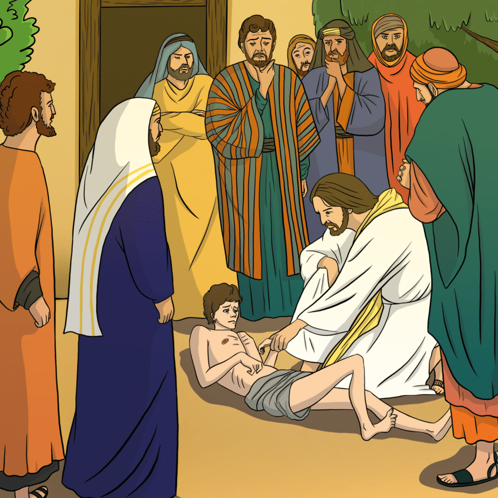 Иисус и трое Его учеников спустились с горы. Тут к Нему подбежал один человек и, упав на колени, стал умолять: «Господи! Помилуй моего сына! Он ужасно мучается и часто бросается то в огонь, то в воду. В нём живёт злой дух, от которого он сильно страдает. Он кидает его на землю, и потом у мальчика изо рта идет пена, и он скрежещет зубами! Я приводил его к Твоим ученикам, но они не смогли исцелить его!» «О, как долго мне придётся ещё быть среди вас, люди без веры?!» — воскликнул Иисус и велел привести мальчика к Нему. Когда злой дух увидел Иисуса, он бросил мальчика на землю и тот вновь начал биться в судорогах. «Как давно это происходит с ним?» — спросил Иисус. «С самого детства! – ответил отец. — Если возможно, помоги нам!» «Всё возможно верующему!» — ответил Иисус. Со слезами на глазах отец воскликнул: «Я верю! Помоги моему неверию!» Тогда Иисус приказал злому духу: «Выйди из него и впредь не входи в него!» И в тот же момент мальчик выздоровел! Когда Иисус остался наедине со Своими учениками, они спросили его: «Почему мы не смогли исцелить его?» — «Этот дух не может быть изгнан иначе, как молитвой и постом», — ответил Иисус.