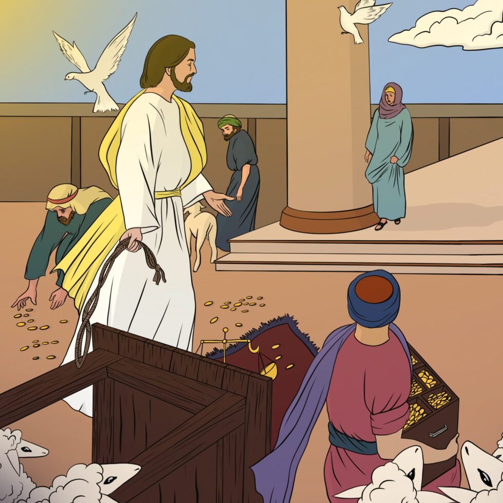 Когда Иисус вошёл в Иерусалим, Он направился в Храм. Храм был святым местом, где Иудеи поклонялись Богу. Но то, что увидел там Иисус, очень огорчило Его. Во дворе Храма торговцы продавали овец и голубей! За столами сидели менялы и разменивали деньги. Людям, приходящим в Иерусалим на поклонение, это было очень удобно — теперь им не нужно было приносить жертву с собой, они могли купить всё необходимое на месте. Когда Иисус всё это увидел, Он сделал кнут из верёвки и выгнал из Храма всех торговцев вместе с их животными. Он опрокинул столы менял и рассыпал их деньги. А продающим голубей повелел: «Вынесите их отсюда!» А затем, обращаясь ко всем, сказал: «Мой дом — дом молитвы для всех народов! А во что вы превратили его? Вы превратили его в сборище разбойников! Вы приходите сюда не для того, чтобы поклоняться Богу, а чтобы зарабатывать деньги!» В Храме было много слепых и хромых людей. Они подходили к Иисусу, и Он исцелял их. Книжники и фарисеи, видя чудеса, которые Он творил, и детей, восклицающих в Храме: «Осанна Сыну Давидову!», вознегодовали. Они сказали Ему: «Слышишь ли, что они говорят?» — «Да, слышу! Разве вы не читали, что из уст детей Бог устроит Себе хвалу?» — отвечал Иисус.