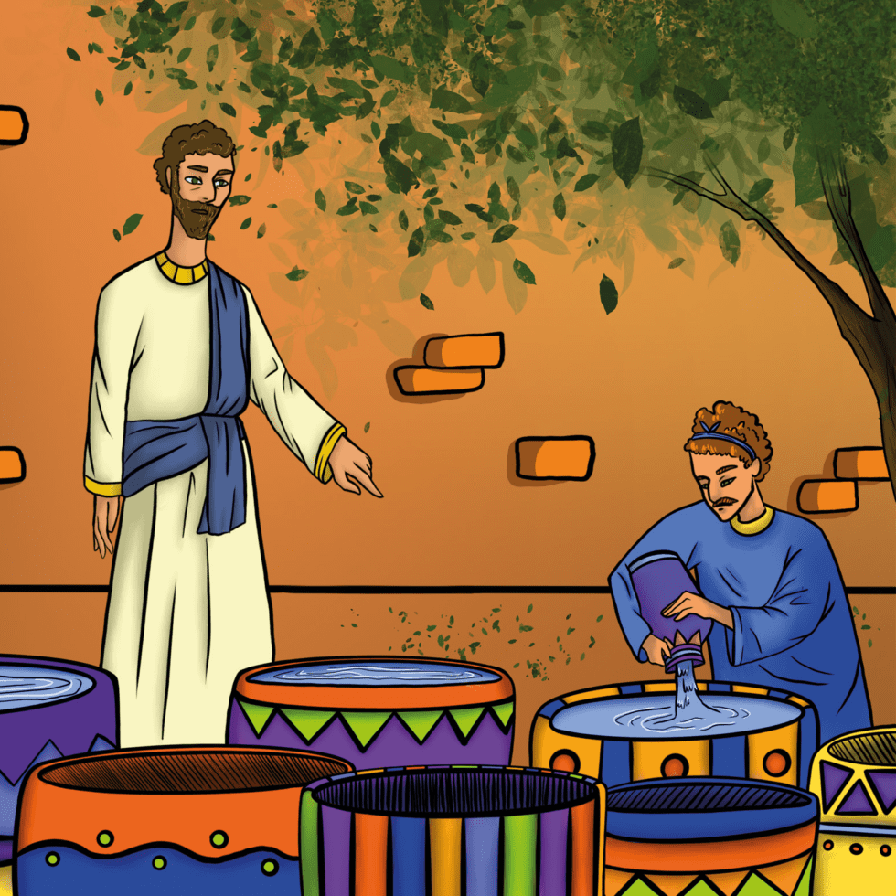 В Кане Ване Галилейской была свадьба, и мать Иисуса была там. На свадьбу были также приглашены Иисус и Его ученики. Когда на этой свадьбе кончилось вино, то мать Иисуса подошла к Нему и сказала: «У них больше нет вина для гостей!» Она была уверена в том, что Иисус может помочь. Иисус ответил ей: «Моё время ещё не настало». Но Мария, подозвав слуг, сказала им: «Что Он вам скажет, то сделайте!» В том доме было шесть больших каменных кувшинов для воды. Тогда Иисус сказал слугам: «Наполните эти кувшины водой!» Они наполнили кувшины до краёв. И произошло чудо – вода стала вином! «А теперь дайте попробовать это распорядителю свадьбы!» — велел им Иисус. Когда распорядитель попробовал воду, которая стала вином, он очень удивился. Он не знал, откуда взялось это вино, об этом знали только слуги. Распорядитель подозвал к себе жениха. «На всех свадьбах сначала подают хорошее вино, а потом — похуже, а ты до сих пор сберёг хорошее вино», — сказал он ему. Это было первое из чудес, совершённых Иисусом. Этим Он показал Своё величие, и Его ученики уверовали в Него.