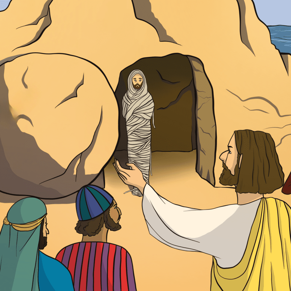 Сёстры Марфа и Мария из Вифании известили Иисуса о том, что их брат Лазарь очень болен. Иисус, услышав это, сказал: «Эта болезнь не к смерти, но к славе Божией. Да прославится через нее Сын Божий!» Только через два дня Он сказал Своим ученикам: «Идём в Вифанию! Наш друг Лазарь умер, но Я иду разбудить его». Когда они пришли в Вифанию, то оказалось, что Лазарь уже четыре дня лежит во гробе. Марфа выбежала навстречу Иисусу и воскликнула: «Господи, если бы Ты был здесь, то не умер бы брат мой! Но я знаю, что и теперь Бог даст Тебе всё, о чём Ты попросишь Его!» — «Твой брат воскреснет! — утешил её Иисус. — Я есть воскресение и жизнь; верующий в Меня, если и умрет, оживет». Увидев плачущую Марию и пришедших с нею других скорбящих людей, Иисус опечалился и прослезился. Вместе с ними Он пришёл ко гробу. «Отвалите камень от пещеры!» — повелел Иисус. Потом, подняв взгляд к небу, помолился и громко позвал: «Лазарь, выйди!» И умерший вышел в своей погребальной одежде. Тогда Иисус сказал людям: «Развяжите его, пусть идёт!» Тогда многие из Иудеев, пришедших к Марии и видевших, что сотворил Иисус, уверовали в Него.