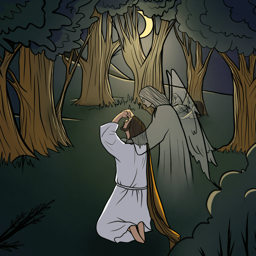 Иисус вместе с учениками пришли на место, называемое Гефсимания. Он сказал им: «Останьтесь здесь, пока Я пойду и помолюсь». Взяв с Собою Петра, Иакова и Иоанна, Господь поднялся на гору. Ему было очень тяжело на душе, и Он попросил учеников: «Душа Моя скорбит смертельно. Побудьте здесь и бодрствуйте со Мною!» Иисус прошёл немного дальше, низко склонился и горячо взмолился: «Отче Мой! Если возможно, да минует Меня эта чаша. Впрочем, не как Я хочу, но как Ты». От сильного напряжения и тяжёлых переживаний с Его лица на землю стекал пот, который был как капли крови. Тогда явился Ангел с неба, который укрепил Иисуса. А ученики тем временем заснули. Когда Он поднялся после молитвы, то подошёл к ученикам и сказал: «Неужели вы не могли один час бодрствовать со Мною? Бодрствуйте и молитесь, чтобы не впасть в искушение: дух бодр, плоть же немощна». Иисус отошёл от них во второй раз и снова молился. «Отец! Если эта чаша не может пройти мимо Меня, и Мне нужно выпить её, то пусть будет воля Твоя!» — говорил Он. Вернувшись, Иисус снова застал учеников спящими. Он в третий раз отошёл и опять молился о том же. И когда Он вернулся назад, то разбудил учеников: «Вы всё ещё спите?! Встаньте! Вот, приблизился предающий Меня!»