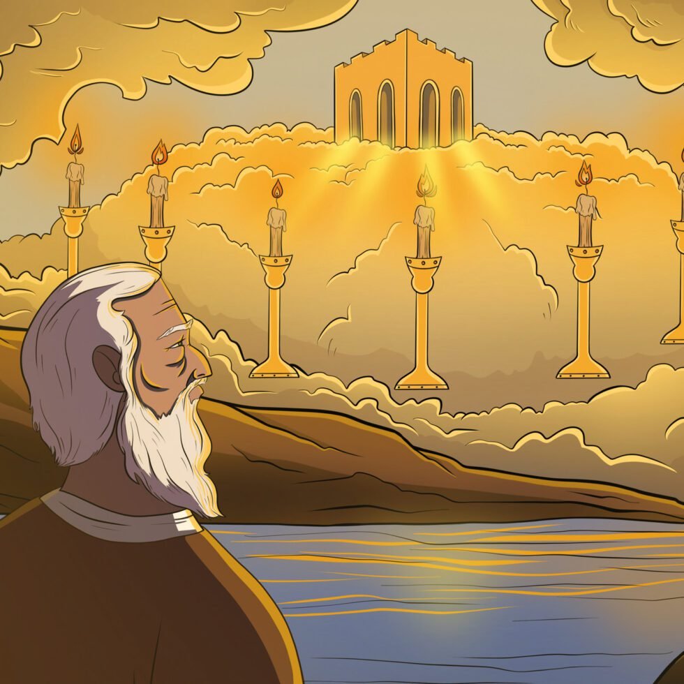 Одного из учеников Иисуса Христа, Апостола Иоанна, сослали на остров Патмос за Слово Божие и за проповедь Евангелия. Однажды в воскресный день он молился Богу и вдруг услышал громкий голос: «Я есмь Альфа и Омега, Первый и Последний! То, что Я тебе скажу, запиши и отправь семи Церквам в Асии». Обернувшись, Иоанн увидел семь золотых светильников, а среди них — Того, Кто был похож на Сына Человеческого. Он был одет в длинную одежду и опоясан золотым поясом. Его волосы были белыми как снег, глаза — как огненное пламя, ноги — как раскалённая медь, а голос — как шум водопада. В руке Он держал семь звёзд, из Его уст выходил острый с обеих сторон меч, а лицо сияло, как солнце. Увидев это, Иоанн упал к Его ногам как мёртвый. Но Он положил на него Свою правую руку и сказал: «Не бойся! Я был мёртв, а теперь жив во веки веков. У Меня — ключи от ада и смерти. Запиши то, что сейчас видишь, и то, что произойдёт после этого. Тайна семи звезд, которые ты видел в Моей руке, и семи светильников такова: семь звёзд — это ангелы семи Церквей, а семь светильников — это семь Церквей!»