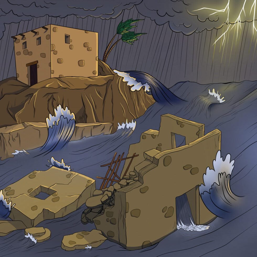 Заканчивая Нагорную проповедь, Иисус рассказал притчу о двух строителях, которые строили для себя дома. «Каждый, кто слушает Мои слова и исполняет их, похож на благоразумного человека, который построил свой дом на камне. Он хорошо потрудился: выкопал яму и положил крепкий фундамент. Когда пошёл сильный дождь, разлились реки и подули ветры, то они с силой обрушились на этот дом! Но, несмотря на это, дом не упал, потому что он был построен на камне!» — сказал Иисус. Затем Он продолжил: «А каждый, кто слушает Мои слова, но не исполняет их, похож на легкомысленного человека, который построил свой дом на песке. Этот человек решил не тратить много сил и времени, и построил свой дом прямо на песке, не заботясь о каменном фундаменте. Когда пошёл сильный дождь, разлились реки и подули ветры, то они обрушились на этот дом. Стены дома не выдержали и рухнули. И падение этого дома было великое», — закончил Иисус Свой рассказ. Весь народ удивлялся Его учению. В словах Иисуса люди почувствовали силу и власть, которых не было у книжников и фарисеев. Когда Он сошел с горы, за Ним последовало множество народа.
