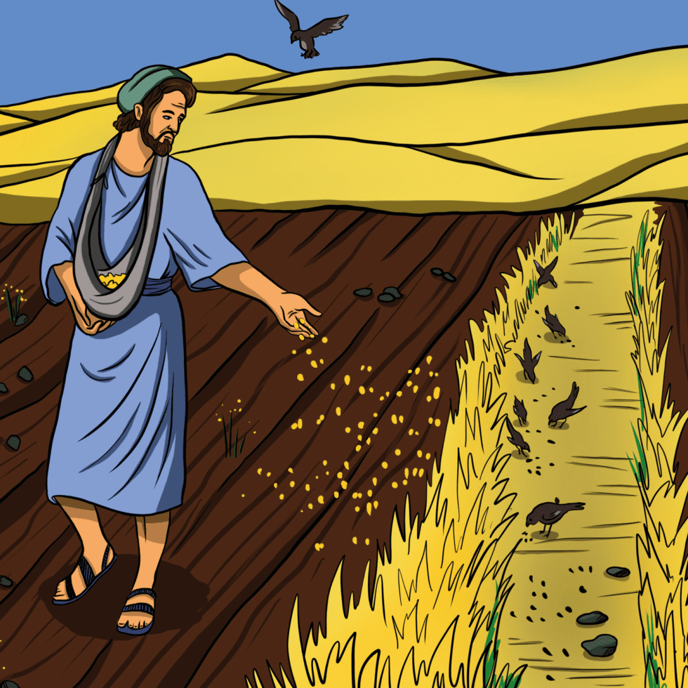 Иисус сидел на берегу озера, и множество людей окружало Его. Он вошёл в лодку и начал учить народ: «На поле вышел сеятель сеять. Когда он разбрасывал зёрна, некоторые из них упали на дорогу, и их поклевали птицы. Другие упали на каменистую почву, где было мало земли, поэтому они быстро проросли. Когда же взошло солнце, эти растения завяли: ведь у них не было глубокого корня. Часть семян упала среди колючек, которые погубили их. Но остальные семена упали на хорошую почву и принесли плод: одни — в сто, другие — в шестьдесят, а третьи — в тридцать раз больше зёрен, чем было посеяно». Затем Иисус объяснил эту притчу Своим ученикам: «Кто слушает Слово Божье, но не хочет его понять, чтобы исполнить, у того сатана крадёт это Слово из его сердца: вот что значит посеянное при дороге. А посеянное на каменистых местах означает того, кто слышит Слово и с радостью принимает его. Но это Слово входит в него неглубоко и не имеет корня. Поэтому, когда начинаются трудности, этот человек перестаёт верить Богу. Посеянное в колючках означает того, кто слышит Слово, но постоянная озабоченность и желание разбогатеть заглушают Слово, и оно не приносит плода. А посеянное на доброй почве означает того, кто слышит Слово и принимает его, желая исполнить. Такие люди приносят плод: одни — в сто раз больше, другие — в шестьдесят, а третьи — в тридцать.