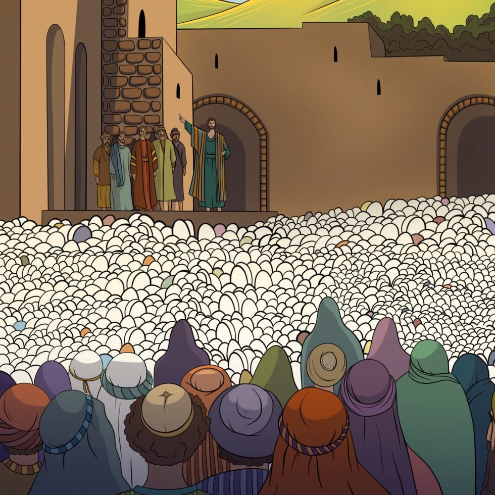 Видя, что народ изумлён и растерян, Апостолы встали, и Пётр громким голосом обратился ко всем: «Послушайте внимательно то, что я скажу вам! Говорящие на разных языках не пьяны. Но произошло то, что было предсказано пророком Иоилем: «В последние дни изолью Дух Мой на людей! И всякий, кто призовёт имя Господа, спасётся!»» Затем Пётр продолжил: «Израильтяне! Вы видели чудеса, которые Иисус совершал Божьей силой. Этого Иисуса вы распяли и убили. Но Бог воскресил Его из мёртвых, о чём предсказывал царь Давид. Мы сами видели воскресшего Иисуса, Который на наших глазах поднялся на Небо и потом послал нам обещанного Святого Духа. Итак, твердо знай, весь дом Израилев, что Бог соделал Господом и Христом Этого Иисуса, Которого вы распяли». Слыша эти слова, люди были потрясены. Они спросили Апостолов: «Братья, что нам теперь делать?» Тогда Пётр ответил им: «Покайтесь, и пусть крестится каждый из вас во имя Иисуса Христа для прощения грехов! И получите дар Святого Духа». В этот день около трёх тысяч человек покаялись в грехах, крестились и присоединились к Церкви Христовой. Они постоянно пребывали в учении Апостолов, в общении и преломлении хлеба и в