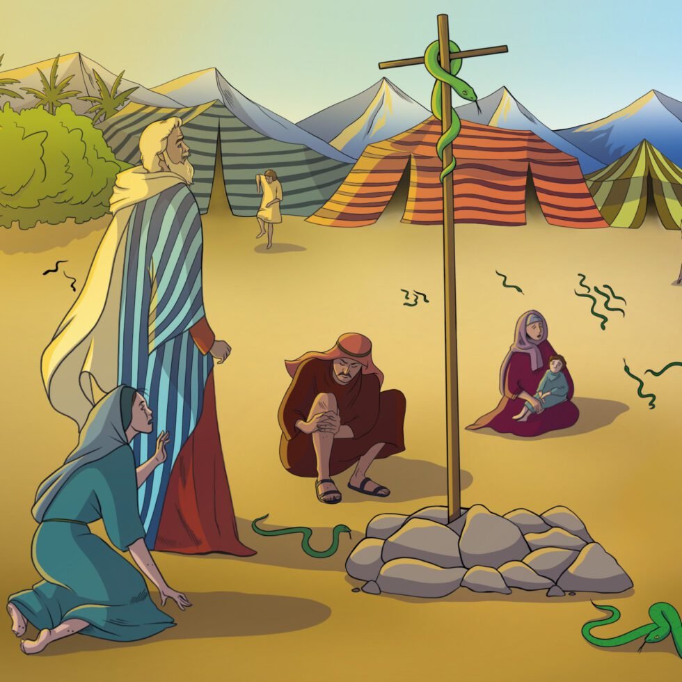 Израильтяне уже долгие годы странствовали по пустыне. Когда облачный столп, который вёл их, останавливался, то они разбивали свой лагерь. Если столп двигался дальше, то они вновь отправлялись в путь. В течение сорока лет они каждый день могли видеть, как Бог заботится о них. У них всегда была еда и питьё. Бог защищал их от врагов и диких животных. Их одежда и обувь не изнашивалась. Но, несмотря на всё это, народ всё равно часто был недовольным. Однажды, когда они шли вдоль Красного моря, народ опять стал говорить против Бога и против Моисея: «Зачем вы вывели нас из Египта? Неужели, чтобы нам умереть в пустыне? Здесь нет ни настоящего хлеба, ни воды, нам надоело есть одну только манну! Она нам опротивела. Мы хотим другой еды!» За этот ропот Господь послал на народ ядовитых змей. Они жалили людей, и от их укусов умерло множество Израильтян.
