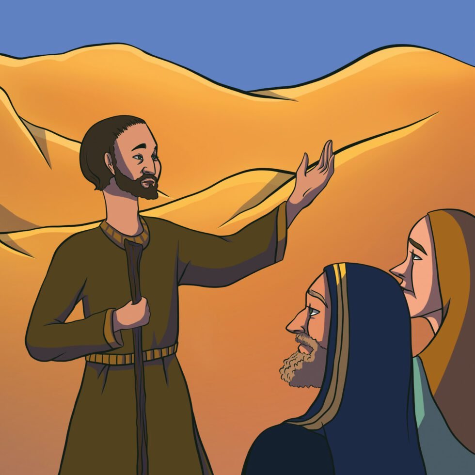 Прошло время. Иоанн, сын Захарии и Елисаветы, вырос. Он жил в пустыне и носил одежды из верблюжьего волоса, перевязывая их кожаным поясом. Пищей его были саранча и дикий мед. Ему исполнилось тридцать лет и вот, наконец, пришло время, когда Иоанн начал служение, которое ему предназначил Бог. Ему нужно было приготовить путь Христу — Спасителю мира. Иоанн отправился к Иордану и проповедовал там. Со всех сторон Иудеи приходили люди, чтобы послушать его. «Покайтесь, ибо приблизилось Царство Небесное!» — говорил Иоанн. И многие люди, слыша его, крестились в реке Иордан, исповедуя свои грехи. Когда люди спрашивали Иоанна: «Что же нам теперь делать?», он отвечал им: «Если у вас есть две рубашки, отдайте одну тому, кому она нужна. И если вы видите голодного, поделитесь с ним едой. Будьте со всеми честными и добросовестно выполняйте свою работу!» — наставлял их Иоанн. Фарисеи тоже приходили послушать Иоанна. Но он, обращаясь к ним, говорил: «Не думайте высоко о себе! Если вы принадлежите Израильскому народу, но при этом не хотите раскаиваться в своих грехах, Бог обязательно накажет вас! Вы не избежите Божьего суда!»