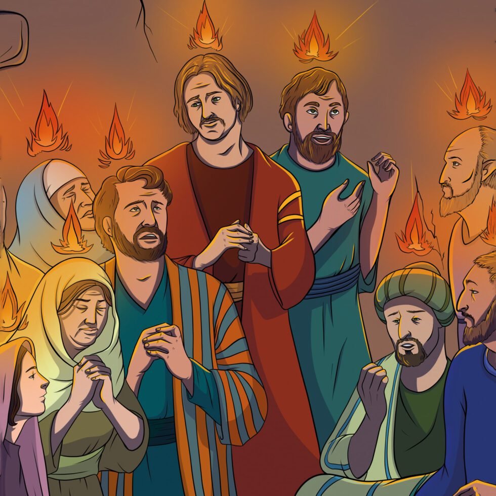 Вдень праздника Пятидесятницы ученики Иисуса собрались все вместе. Вдруг послышался шум с неба, как будто от порыва ветра огромной силы, и наполнил весь дом, в котором они находились. Неожиданно ученики увидели нечто похожее на языки пламени, которые приблизились к ним и, разделившись, опустились на каждого из них. После этого они все исполнились Духом Святым и начали говорить на разных языках. В это время в Иерусалиме было множество набожных Иудеев из разных стран, которые пришли на праздник для поклонения Богу. Когда люди услышали шум с неба, они собрались возле дома, в