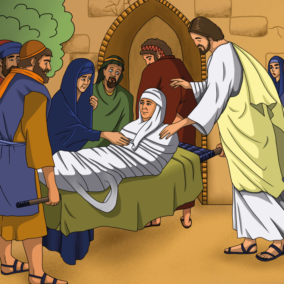 Выйдя из Капернаума, Иисус вместе со Своими учениками направился в город Наин. С каждым днём всё больше и больше людей собиралось вокруг Иисуса, чтобы послушать Его слова и посмотреть на чудеса, которые Он творит. Дойдя до ворот города, они увидели идущую им навстречу траурную процессию. Умер единственный сын вдовы из Наина. Вместе с ней шло много людей из этого города. Господь посмотрел на несчастную мать и, сжалившись над ней, сказал: «Не плачь!» Потом Он подошёл к носилкам, на которых несли мёртвого, и прикоснулся к ним. Люди, нёсшие носилки, остановились. И тогда Иисус произнёс: «Юноша! Говорю тебе, встань!» Юноша стал дышать, поднялся, сел и заговорил. Так Иисус возвратил матери её сына живым! О, как счастлива была она, когда увидела своего воскресшего сына! А всех, кто присутствовал при этом, объял страх, и они славили Бога, говоря: «Великий пророк восстал между нами, и Бог посетил народ Свой». Они никогда раньше не видели, чтобы кто-то мёртвый вновь стал живым! Люди начали рассказывать о том, что произошло, своим друзьям и знакомым. И теперь ещё больше людей знали о чудесных делах Иисуса!