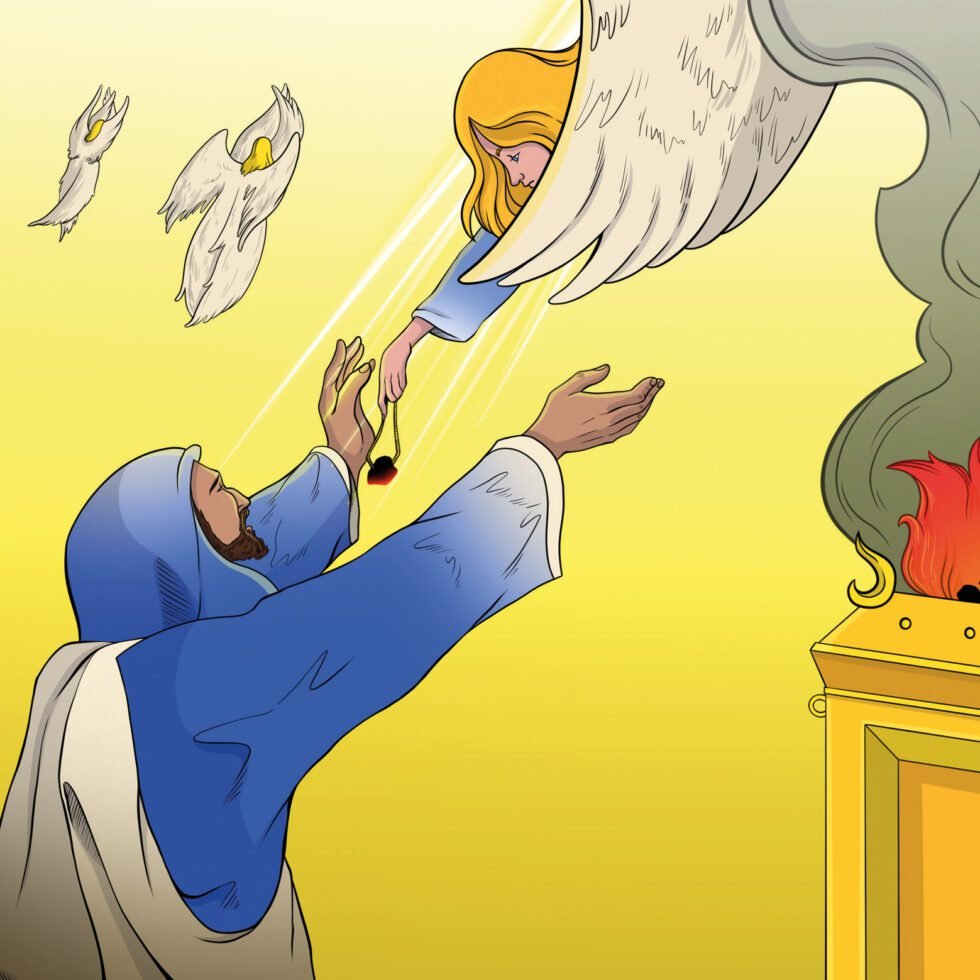В земле Иудейской жил человек по имени Исаия. Он видел, как люди вокруг него грешили и не повиновались Богу. Однажды Бог показал Исаии необычное видение: Господь Бог сидел на большом высоком троне. Его одежды заполняли весь храм! А вокруг Него было множество Ангелов, которые громко восклицали: «Свят, Свят, Свят Господь Саваоф! Вся земля полна славы Его!» «Горе мне! Погиб я! — воскликнул Исаия. — Ибо я человек с нечистыми устами, и живу среди народа также с нечистыми устами, — и глаза мои видели Царя, Господа Саваофа!» Но вдруг один из Ангелов подлетел к жертвеннику, взял щипцами горящий уголь и приблизился к пророку. Он коснулся углём его губ и сказал ему, что теперь его грех удалён от него. И услышал Исаия голос Бога, Который говорил: «Кого мне послать?» Тогда Исаия ответил Ему: «Вот я, пошли меня!» И Бог послал Исаию к Своему народу и велел передать им Его слова. Но Он также предупредил, что народ не станет его слушать. Исаия спросил, как долго они не будут слушать. Господь ответил ему: «Пока не опустеют города, и останутся без жителей, и пока земля эта совсем не опустеет. Но Я не истреблю их полностью. Я оставлю некоторых из них, чтобы показать им Свою милость!»