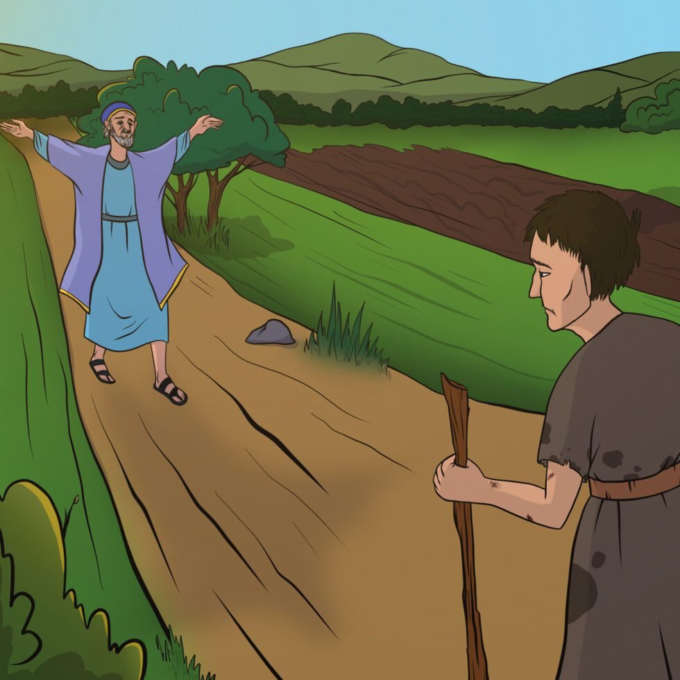 Иисус рассказал книжникам и фарисеям ещё одну притчу: У одного человека было два сына. Однажды младший сын сказал отцу: «Отдай мне часть наследства, которая мне причитается!» Разделив своё имение между двумя сыновьями, отец отдал младшему его часть, и тот, забрав всё, ушёл в далёкую страну. Там он жил так, как хотел, и быстро всё растратил. Когда в той стране начался сильный голод, ему пришлось наняться на работу. Его послали пасти и кормить свиней. А он сам продолжал мучиться от голода и был бы рад есть пищу, которой кормили свиней, но ему не давали и этого. Опомнившись, младший сын подумал: «У моего отца даже слуги едят досыта, а я умираю от голода. Встану, пойду к отцу и скажу ему: «Я очень виноват и уже недостоин быть твоим сыном. Прими меня своим слугой!» Он встал и пошёл к отцу. И, когда он был ещё далеко, отец увидел его, сжалился над ним, побежал ему навстречу, обнял и стал целовать. Младший сын начал говорить: «Отец, я очень виноват и уже недостоин называться твоим сыном…» Но отец тут же приказал слугам: «Оденьте его в лучшую одежду, дайте ему перстень на руку и обувь на ноги! Приготовьте хорошее угощение, будем есть и веселиться: ведь этот сын мой был для меня как умерший, а теперь — ожил. Он был пропавшим, а теперь — нашёлся!»