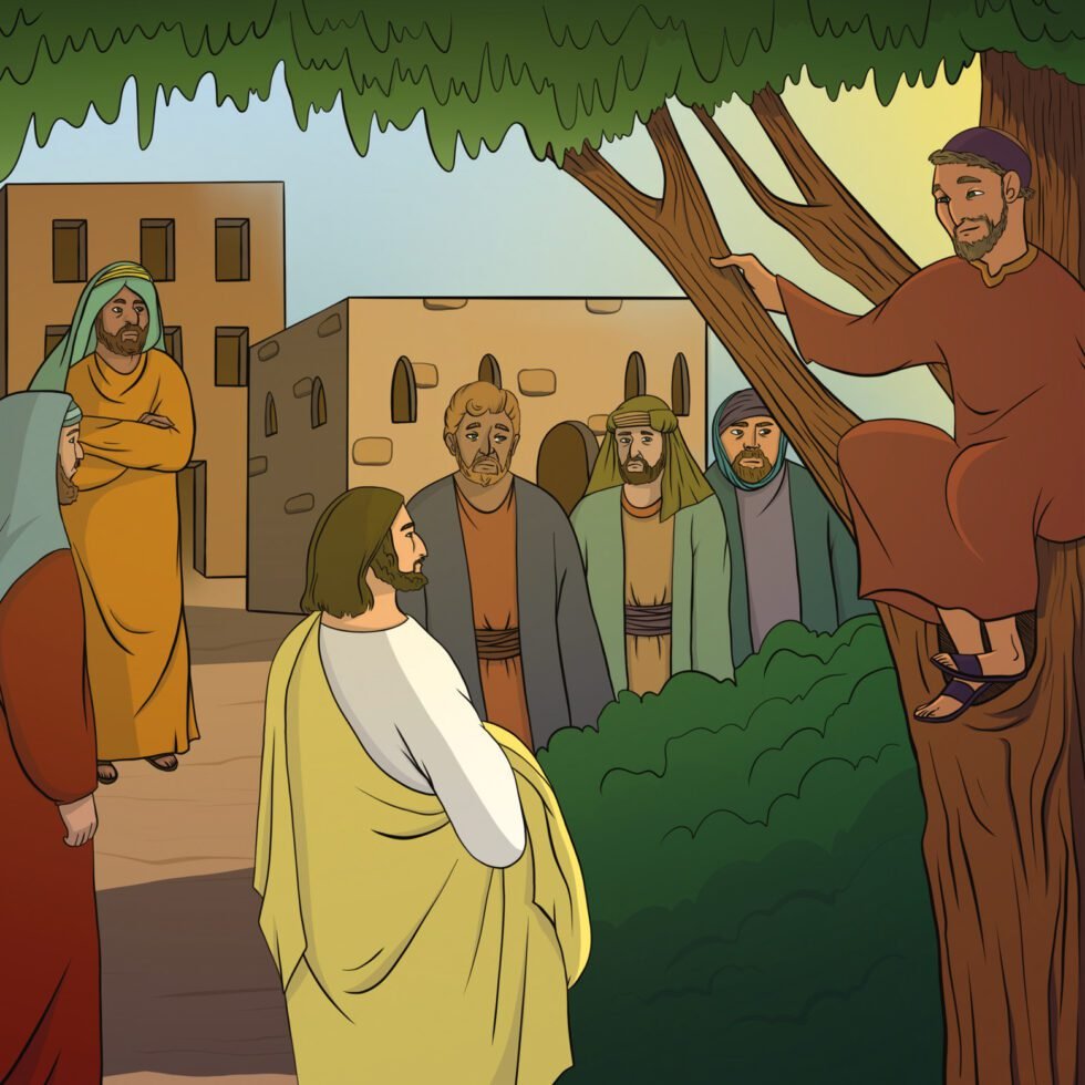 Войдя в город Иерихон, Иисус проходил по его улицам. Здесь жил один богатый человек по имени Закхей, который был начальником мытарей. Его работа заключалась в том, чтобы собирать деньги с народа и отдавать их властям. Но он брал с людей денег больше, чем это требовал закон. Поэтому народ ненавидел его. Закхей очень хотел увидеть Иисуса, но из-за своего маленького роста не мог рассмотреть Его в толпе людей. Поэтому он побежал вперёд и влез на большую смоковницу, чтобы сверху лучше увидеть проходящего по этой дороге Иисуса. Подойдя к дереву, на котором сидел Закхей, Иисус поднял голову, увидел его и сказал: «Закхей, поскорее спускайся вниз, сегодня Я должен быть в твоём доме!» Закхей быстро спустился с дерева и с радостью принял Иисуса. Увидев это, многие возмущённо говорили, что Иисус зашёл в дом к грешному человеку. А Закхей сказал: «Господи! Теперь половину своего имения я раздам нищим, а тем людям, у которых