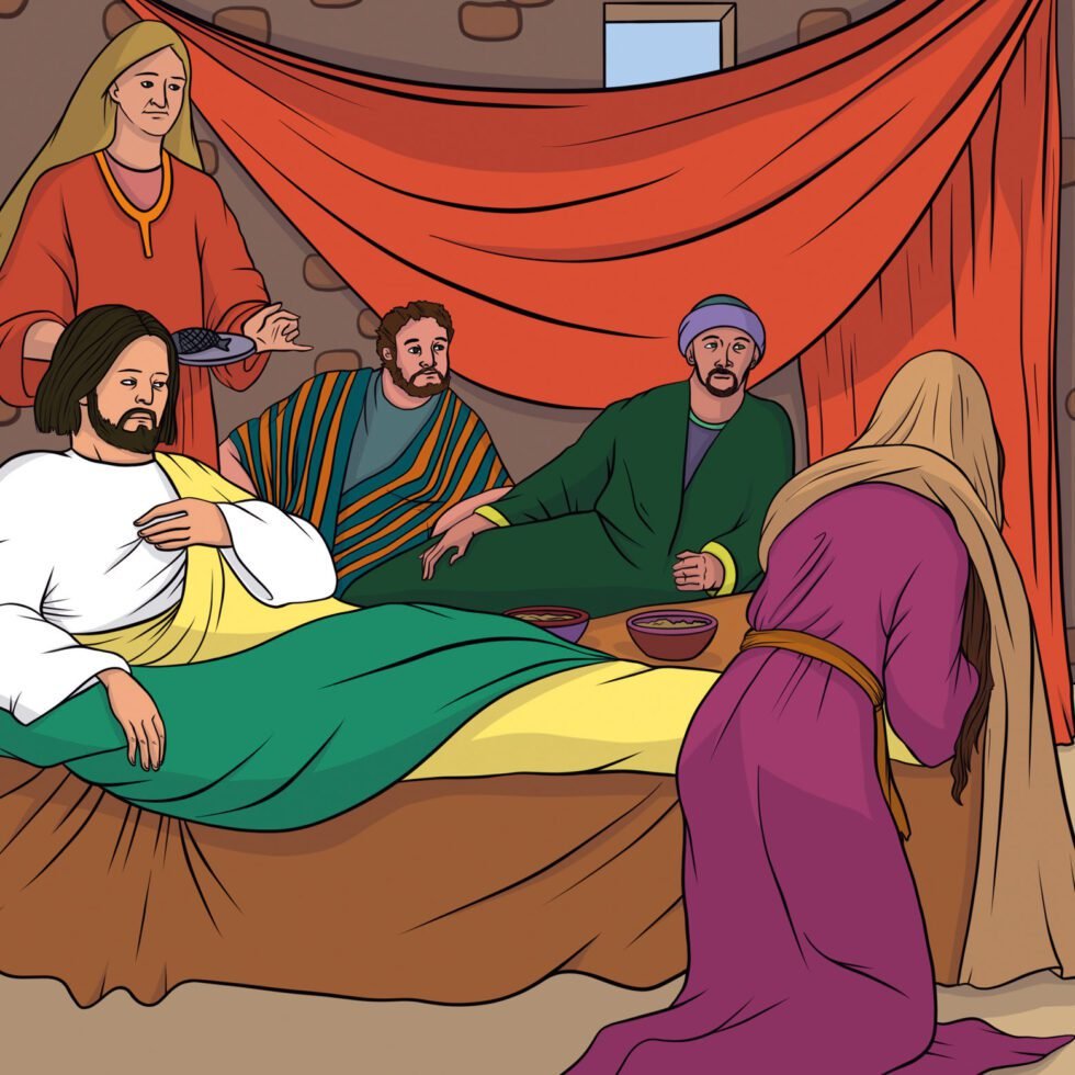 За шесть дней до праздника Пасхи Иисус и Его ученики пришли в Вифанию, где жили Лазарь и его сёстры. Марфа прислуживала им за столом, а Лазарь возлежал вместе с ними. А Мария, взяв драгоценное благоухающее масло, помазала ноги Иисуса и вытерла их своими волосами. После этого весь дом наполнился чудесным ароматом. Тогда один из учеников Иисуса по имени Иуда Искариот, который хотел предать Его, сказал: «Разве не лучше было бы продать это драгоценное масло за триста динариев и раздать деньги нищим?» Но он сказал так не потому, что заботился о нищих, а потому что был вором. Иуда ходил вместе с Иисусом и имел при себе ящик, в котором были общие деньги. Но Иисус вступился за Марию. «Оставьте её в покое! Она сделала для Меня доброе дело. Нищие всегда будут рядом с вами, чтобы вы могли им помогать, а Я — не всегда!» — сказал Он. Многие из Иудеев узнали, что Иисус в Вифании, и пришли не только ради Иисуса, но чтобы увидеть и Лазаря, которого Он воскресил из мёртвых. Первосвященники решили убить и Лазаря, потому что многие Иудеи, увидев его воскресшим, уверовали в Иисуса.